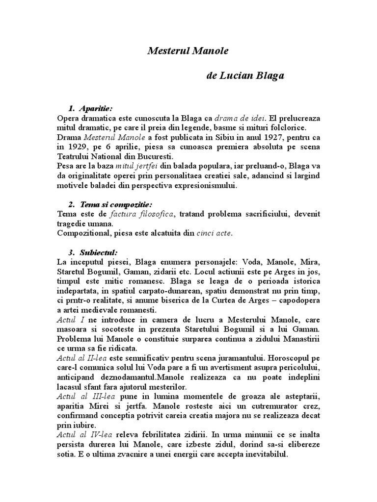 In blaga s version manole s self sacrifice is not prompted by any gesture of prince radu but it is instead a personal journey. Expresionismul este un curent artistic constituit in germania la inceputul secolului al xx lea. Drama mesterul manole apare la sibiu in 1927 si se circumscrie curentului expresionist ca de altfel intreaga creatie blagiana. In bulgaria there is also a legend about a master builder by the name of manol who flew from the minaret mestrrul the selimiye mosque in edirne using eagle wings he crafted.