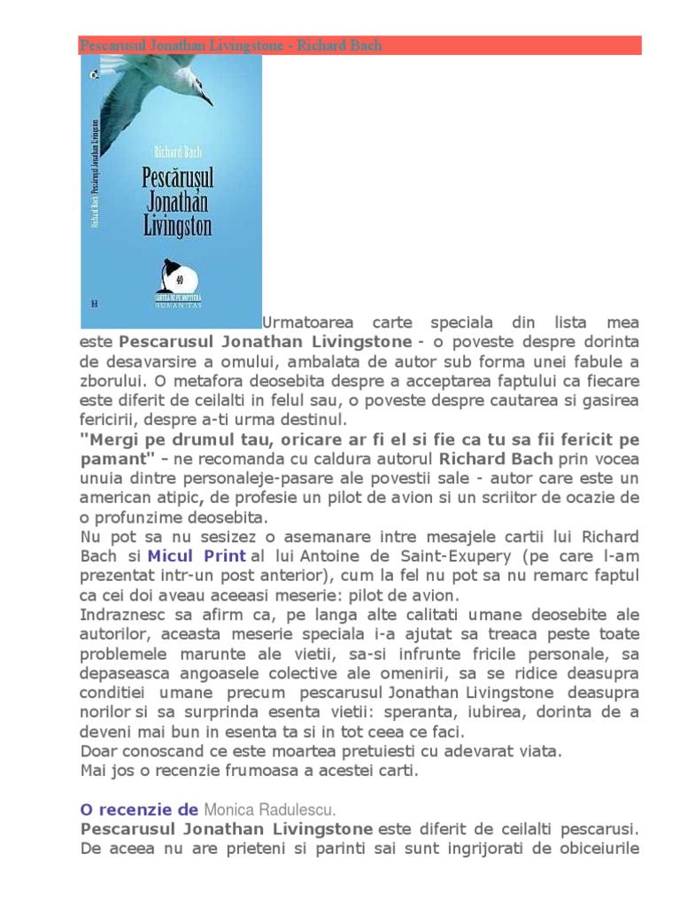 3104748 pescarusul jonathan livingstone de richard bach pdf description o fabulă a zborului pescăruşul jonathan livingston richard bach adevăratul pescăruş jonathan care trăieşte în noi toţi partea i era dimineaţă şi un soare proăspăt strălucea în aur peste clipocitul mării domoale. Am fost marcată profund la terminarea cărţii care mă grăbesc s o spun pentru cei grăbiţi şi fără prea mult timp se poate. Jonathan livingston seagull loved to fly. Cartea poate fi disponibilă în format tipărit iar uneori și ebook carte pdf cu download online sau carte audio.